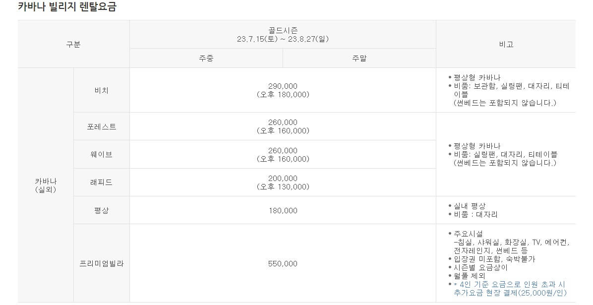 - 카바나 오후권은 잔여석이 있는 경우, 현장에서만 대여 가능합니다. (오후 14:00 이후)