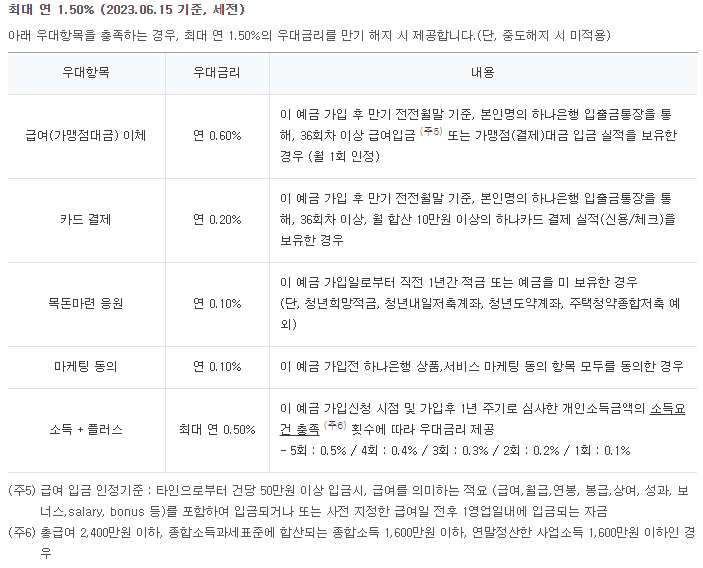 하나은행 하나 청년도약계좌 우대금리는 우대항목을 충족하는 경우, 최대 연 1.50%의 우대금리를 만기 해지 시 제공합니다. 단, 중도해지 시에는 미적용됨을 알려드립니다.
