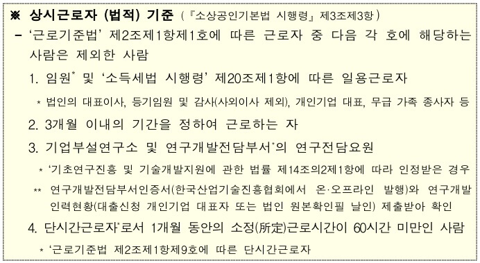 * 소상공인은 소상공인 중 상시근로자 수가 10인 미만인 사업자로서 업종별 상시근로자 수 등이 대통령령으로 정하는 기준에 해당하는 자