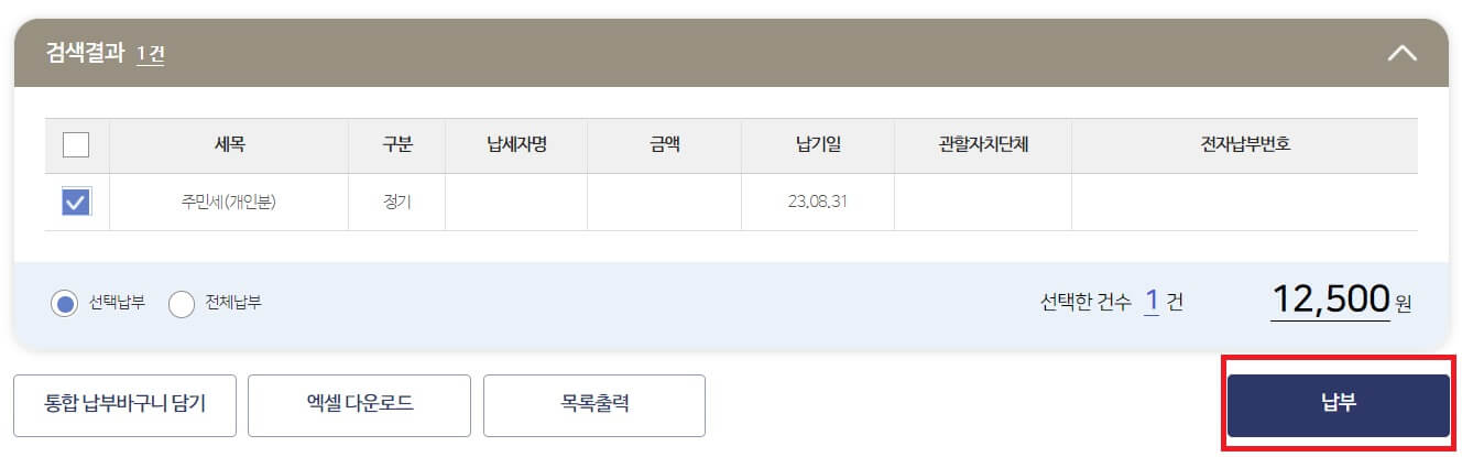 4. 자동 조회된 세금 정보 확인하여 선택 후 납부 진행